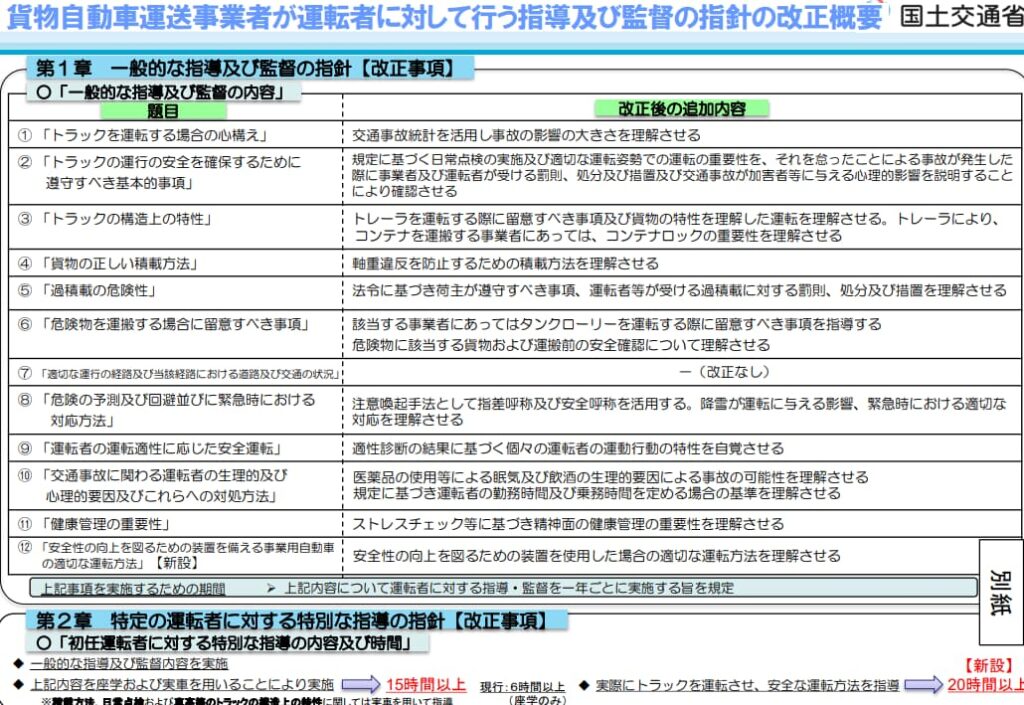 運送会社には、今、「運転者に対して行う指導及び監督の指針」として法定12項目という、基準が作られています。(平成13年8月20日 国土交通省告示第1366号)