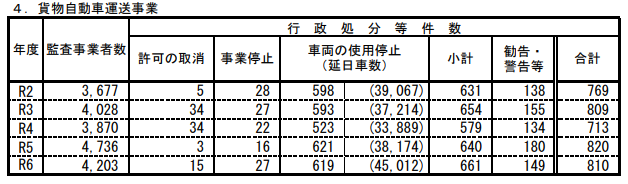 貨物自動車運送事業における行政処分件数は勧告警告を含めると令和2年から6年の平均で784件。